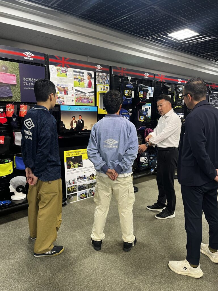 当日、本社内で開催されていた展示会会場も拝見しました。デサント様がサッカーやラグビー向けに新たに開発されたプロテクトヘッドバンドについてご説明いただきました。